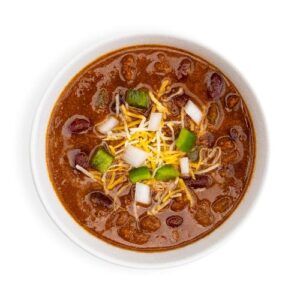 A hardy chili with ground beef, red kidney beans, tomatoes, and a special chili blend.
